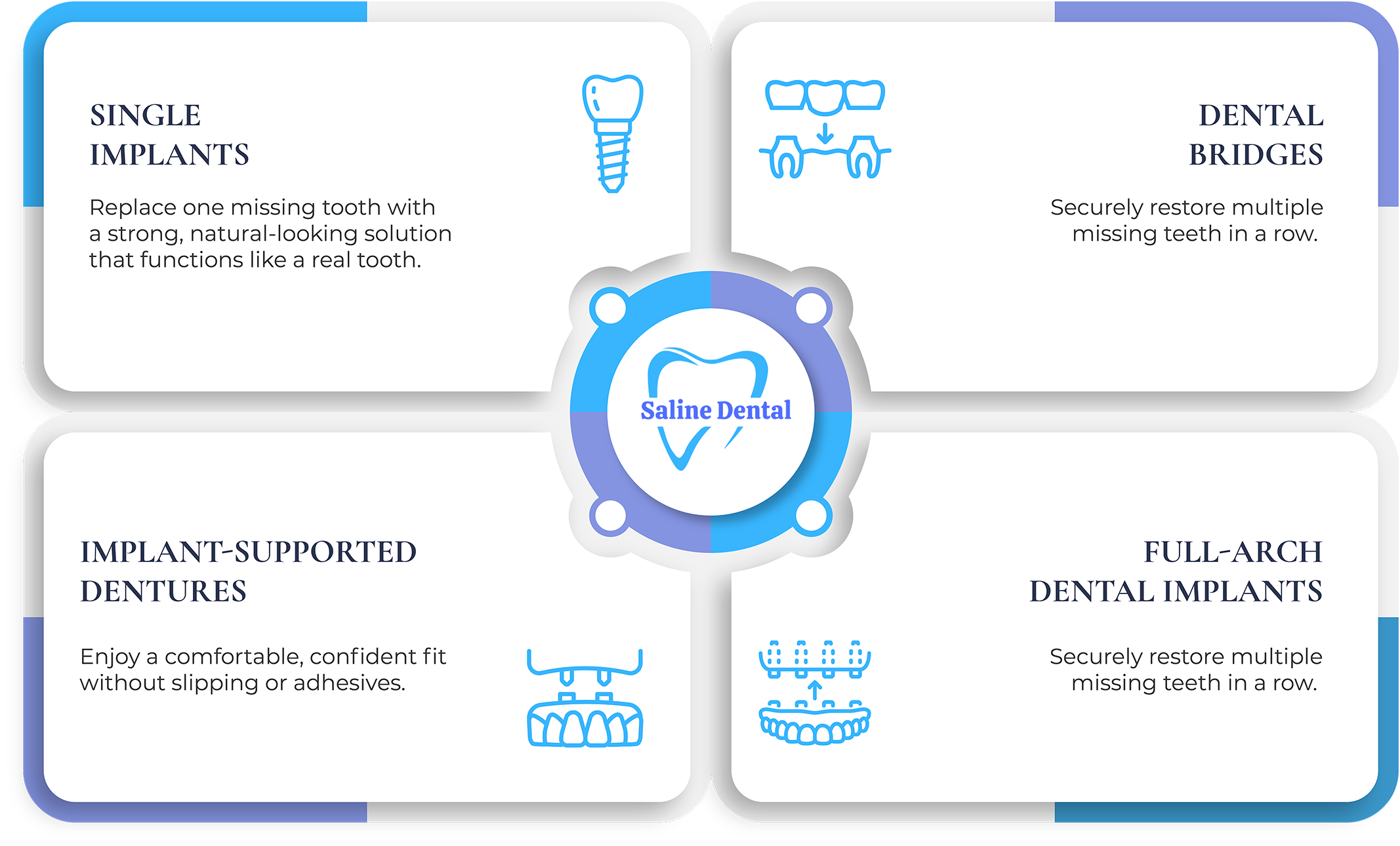 At Saline Dental, we’ve developed our own dental implant brand, Saline Dental AOX, designed to deliver advanced, full-arch smile restoration with precision and consistency. Rather than taking a one-size-fits-all approach, we customize every treatment plan based on your unique anatomy, bone structure, and smile goals.
